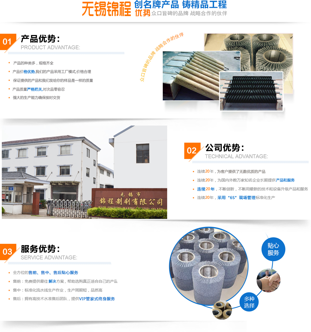 無錫市錦程制刷有限公司,創辦于1995年。位于無錫市惠山區堰橋工業園區,是一家有著多年生產經驗和技術的廠家,專業從事設計制造各種材質和規格的毛刷輥、開幅輥、磨料絲刷、圓盤刷、清洗刷、條刷和鋼絲刷等。品主要用于紡織、印染、皮革、薄膜的整理和除皺;管道的清洗;鋼鐵行業除銹、去毛刺;食品的加工和水果的清洗等。我廠引進進口的制刷專用設備,為您提供全系列的工業刷產品。
